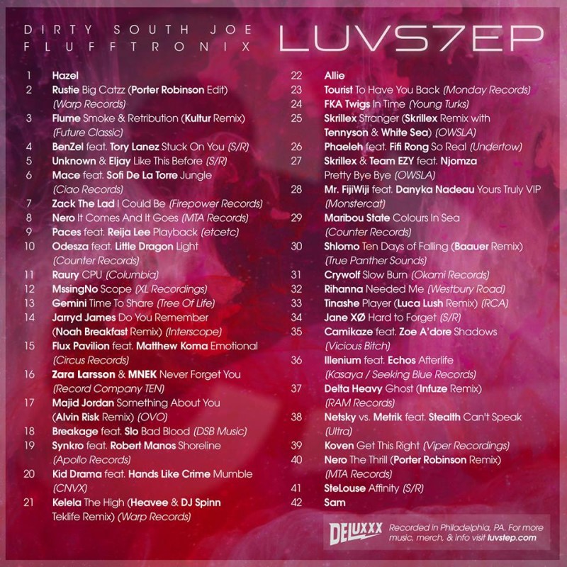 Luvstep 7 is a collection of electronic songs that explore love and mortality. Released on February 29, 2016, the mix contains 39 songs and 3 movie quotes. Some of the artists of Luvstep 7 include Rustie, Flume, Zara Larsson, Maribou State, Crywolf, ILLENIUM, Rihanna and StéLouse.